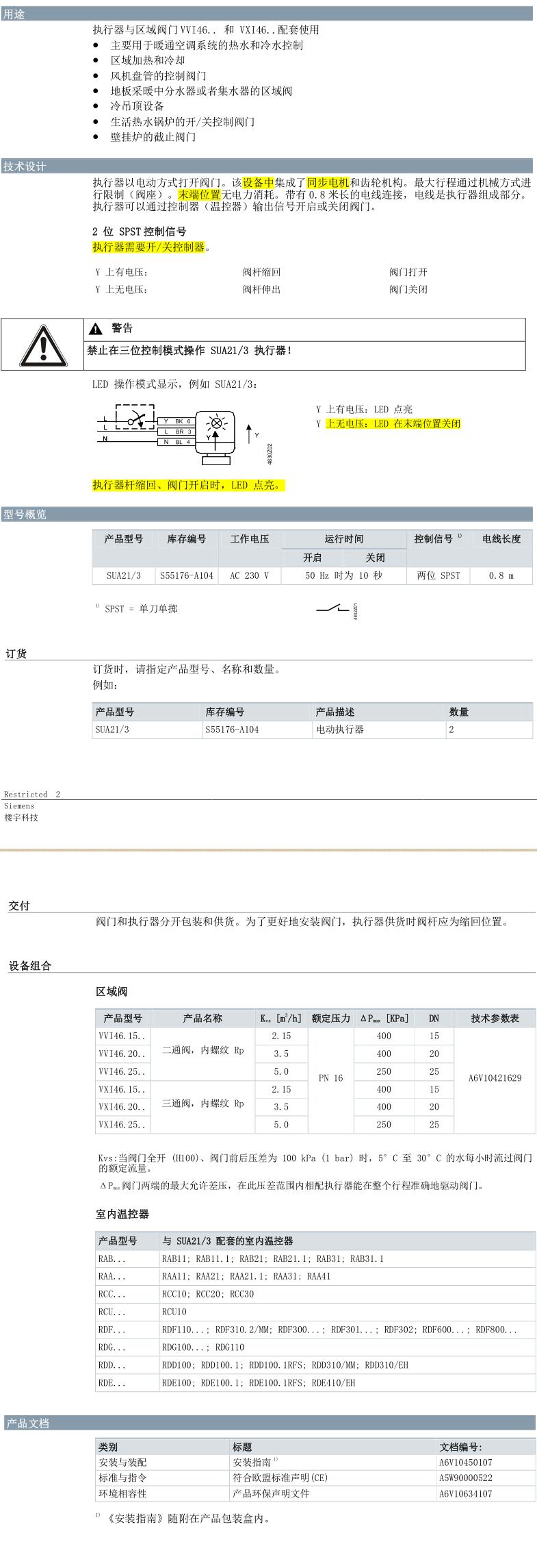 西门子电动三通阀VXI46.20+SUA21适用于操纵通风和空调机系统的封闭系统中水系统的终端装置,例如:诱导器,风机盘管,小型再热器和小型再冷却器。